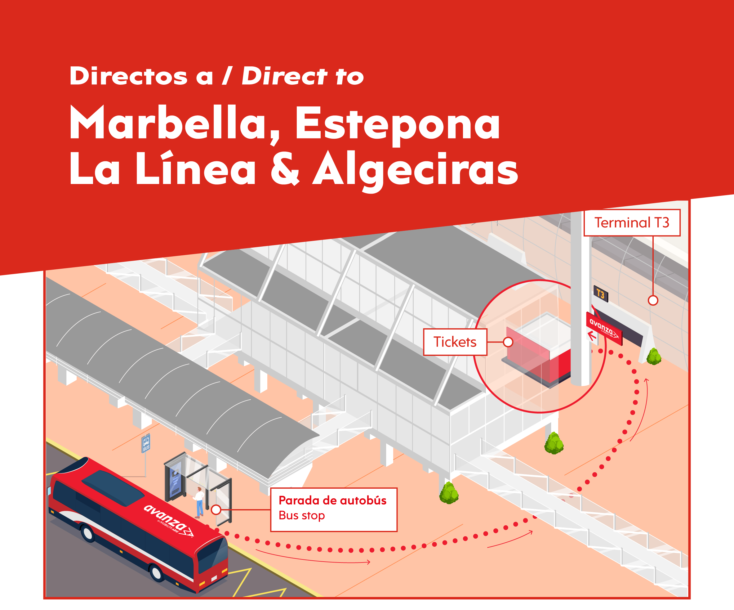 Servicios directos que conectan el Aeropuerto de Málaga con Marbella, San Pedro, Estepona, La Línea y Algeciras. Todos con llegadas y salidas desde la Terminal 3 – Llegadas.
